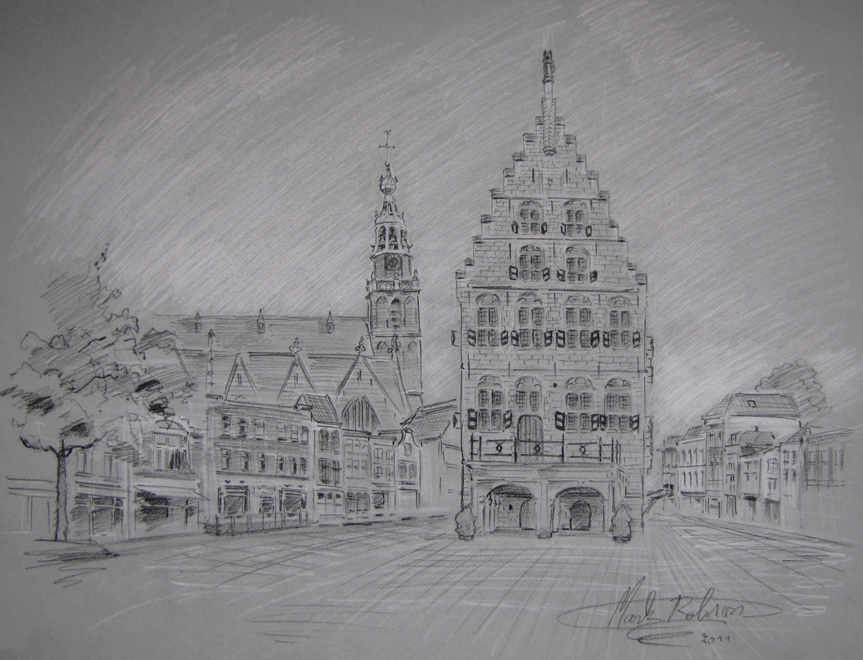 Markt, getekend van naast De Waag