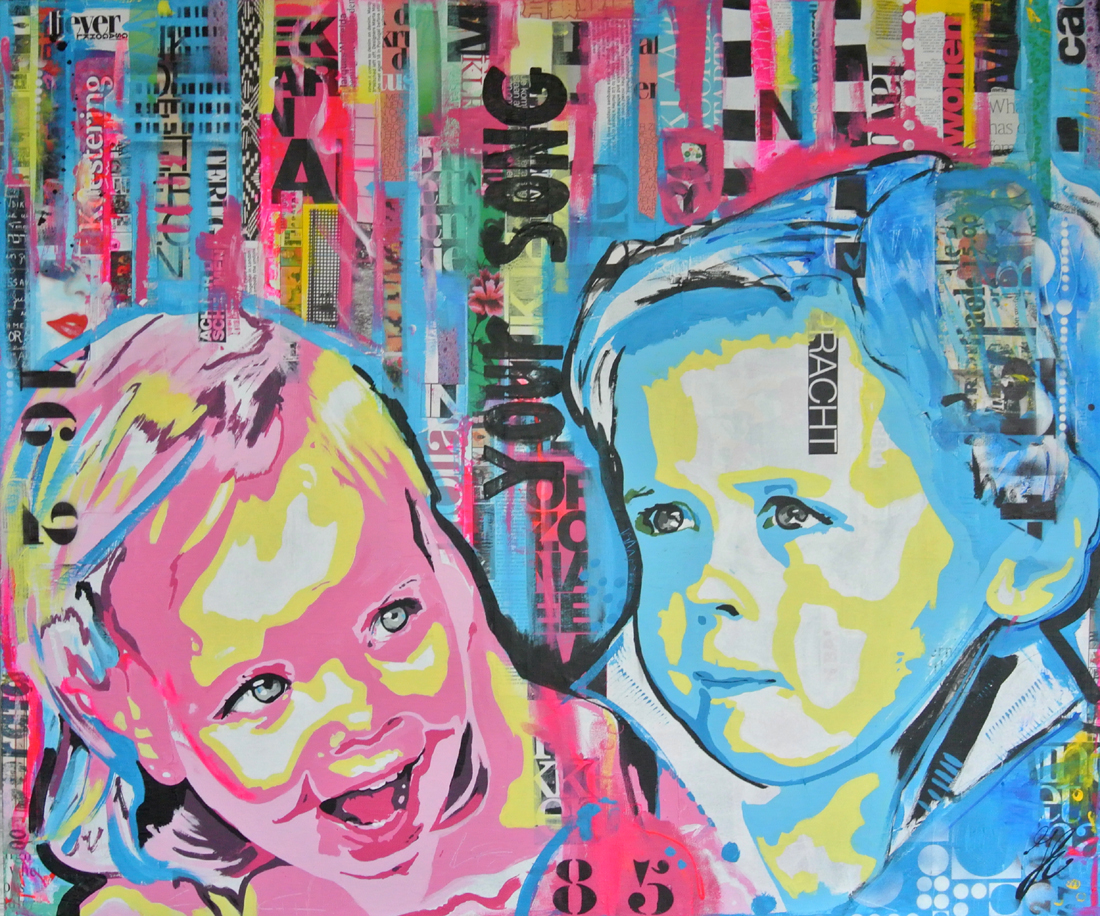 Portret in opdracht, Matz en Merel. Twee aparte foto's heb ik toegevoegd tot één geheel. Favoriete titelsong, data en andere persoonlijke details heb ik op verzoek verwerkt in het schilderij. Achtergrond is mixed media ( krantenknipsels, tijdschriften, papier, inkten, spuitbus, typografie, etc).