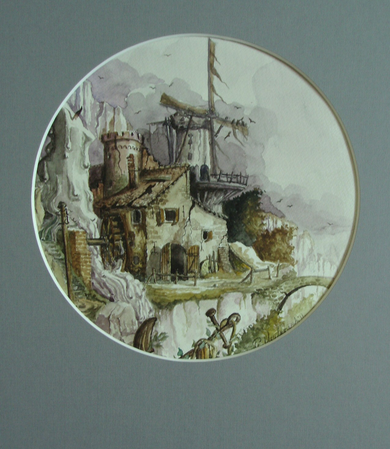 Landschap Romantiek Papier Aquarel Bergen Lucht Vergezicht Realisme Fantasie Vogels Kasteel Anker Kloof Molen Kaars Watermolen
