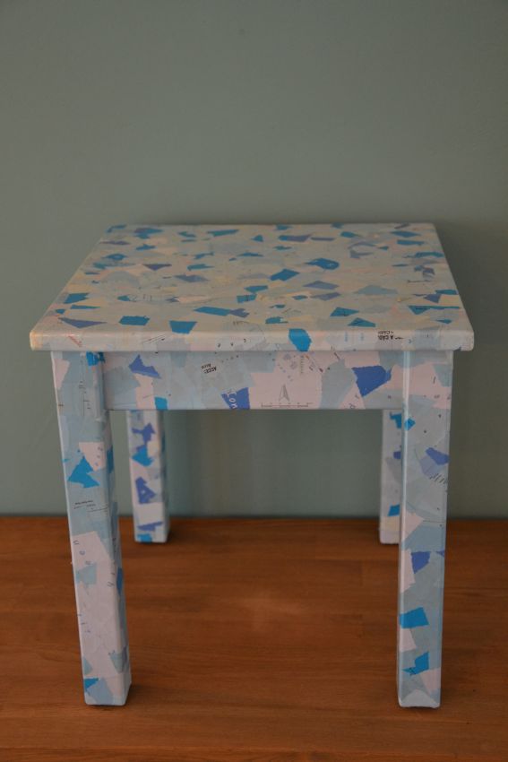 Handgemaakte collage van stukjes blauwe landkaart op een houten tafeltje.