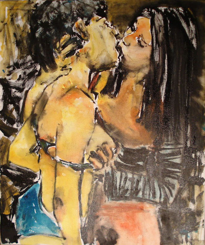 Schilderij waarop 2 kussende vrouwen zijn afgebeeld.