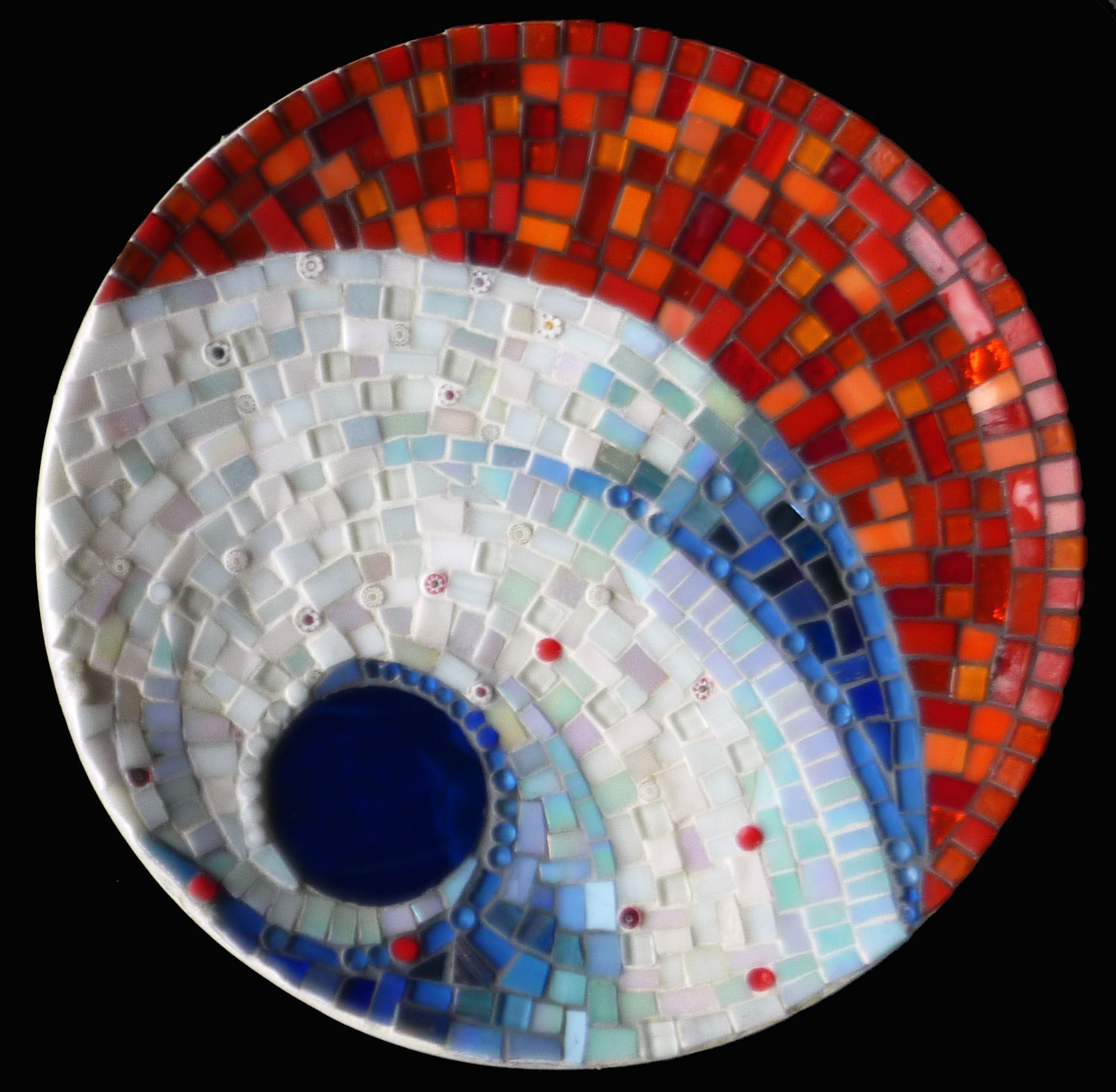 Houten schaal ingelegd met glas mozaïek.