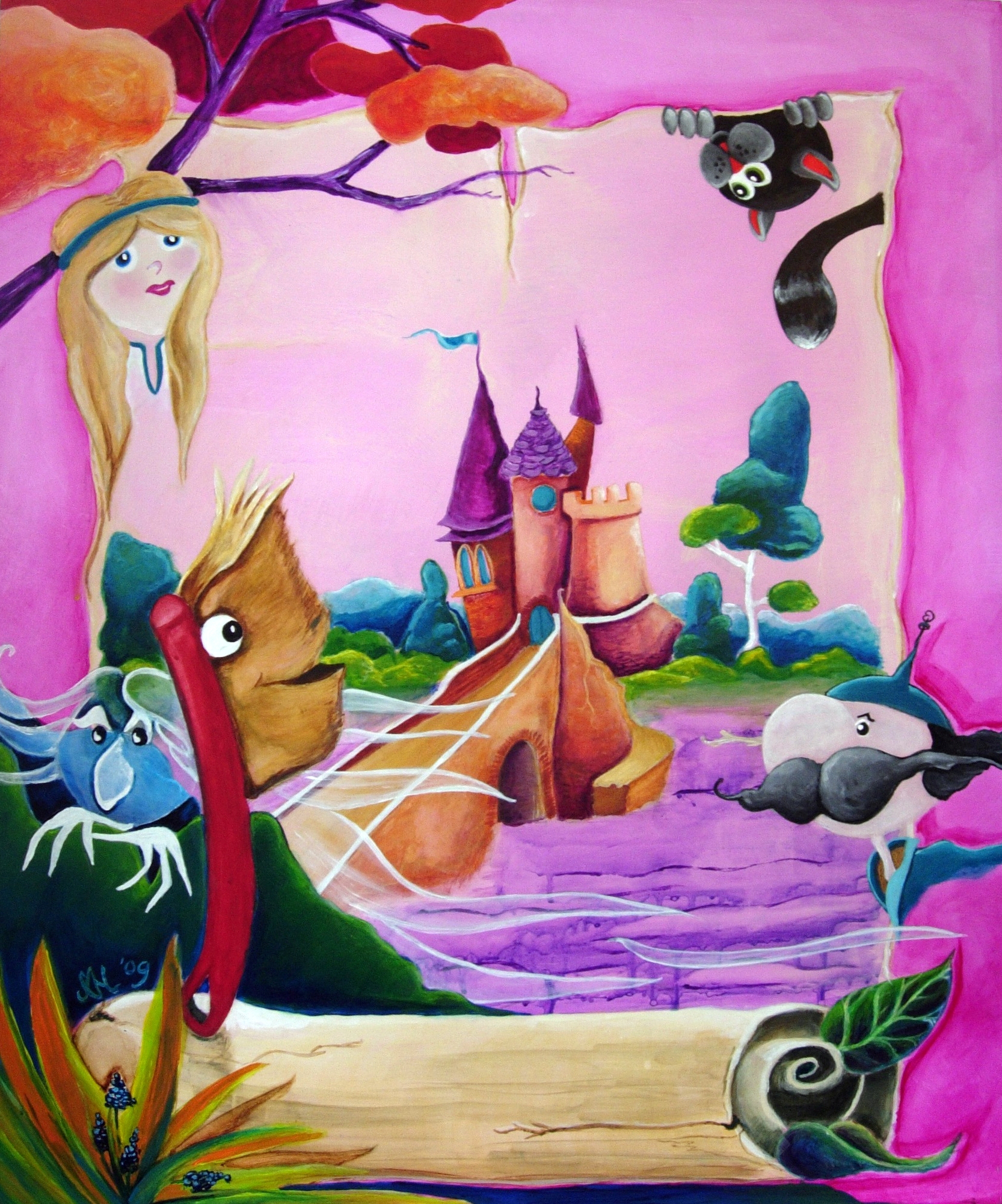 Schilderij Kat Paneel Sprookje Witte Ridder Kasteel Prinses Gekleurd Fel Kinder Muurschildering Borstel Wief Poppentheater