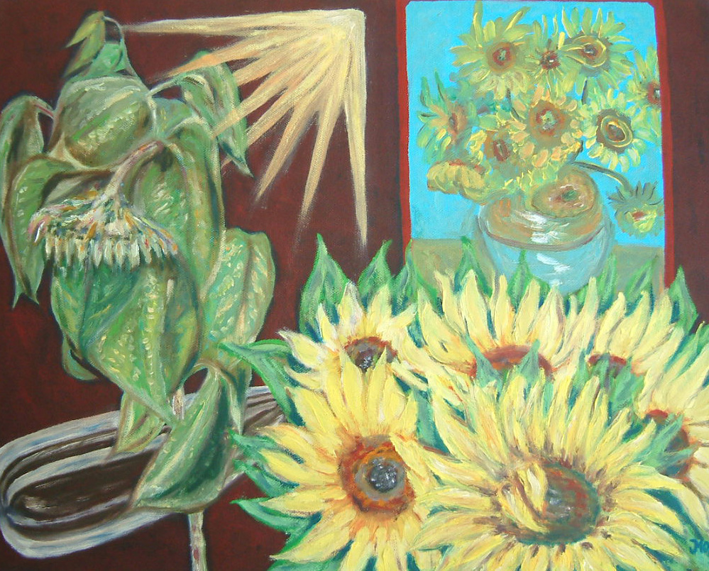 Alle vormen van de zonnebloem zijn hier als compilatie geschilderd. Zelfs tot van Gogh