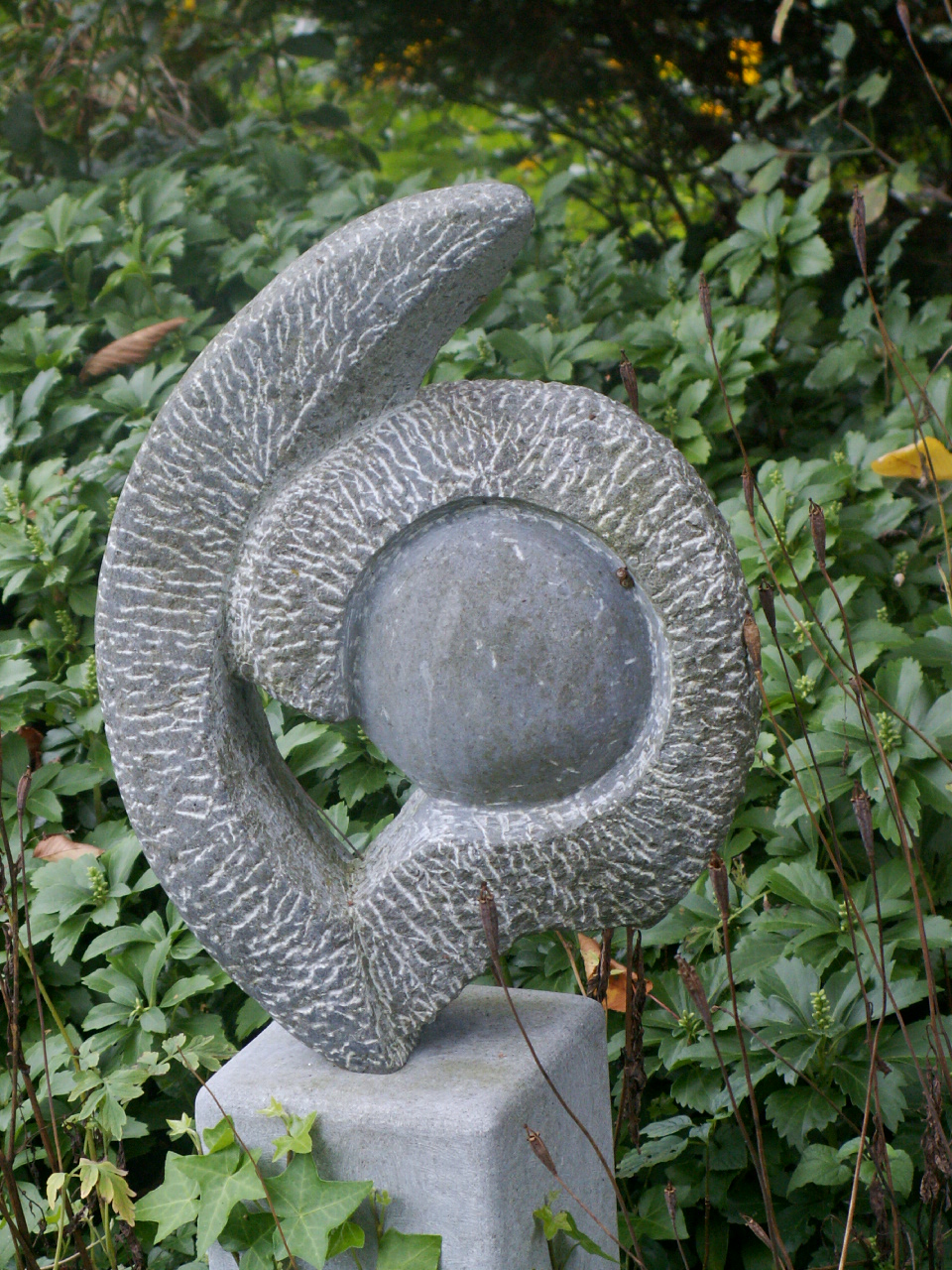 Iers hardsteen. Uitgangspunt: Vrije vorm zonder model. Gehakt zonder vooropgezet plan. Afwerking: deels haksporen, deels gezoet