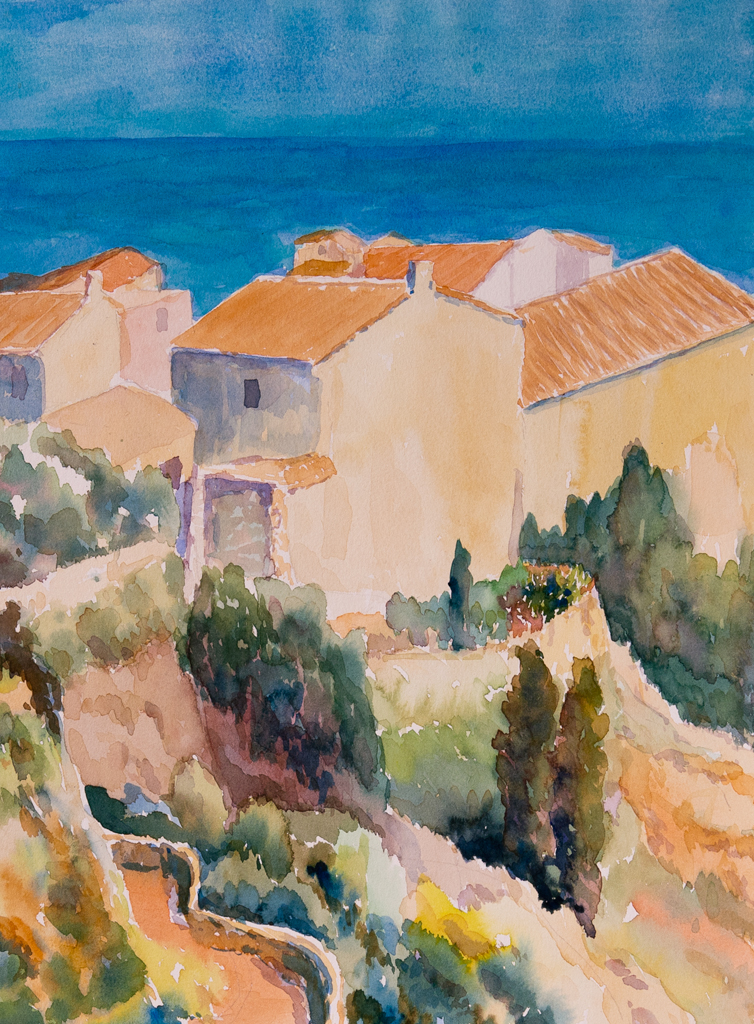 Zeegezicht met dorpshuizen. Meditterane sfeer