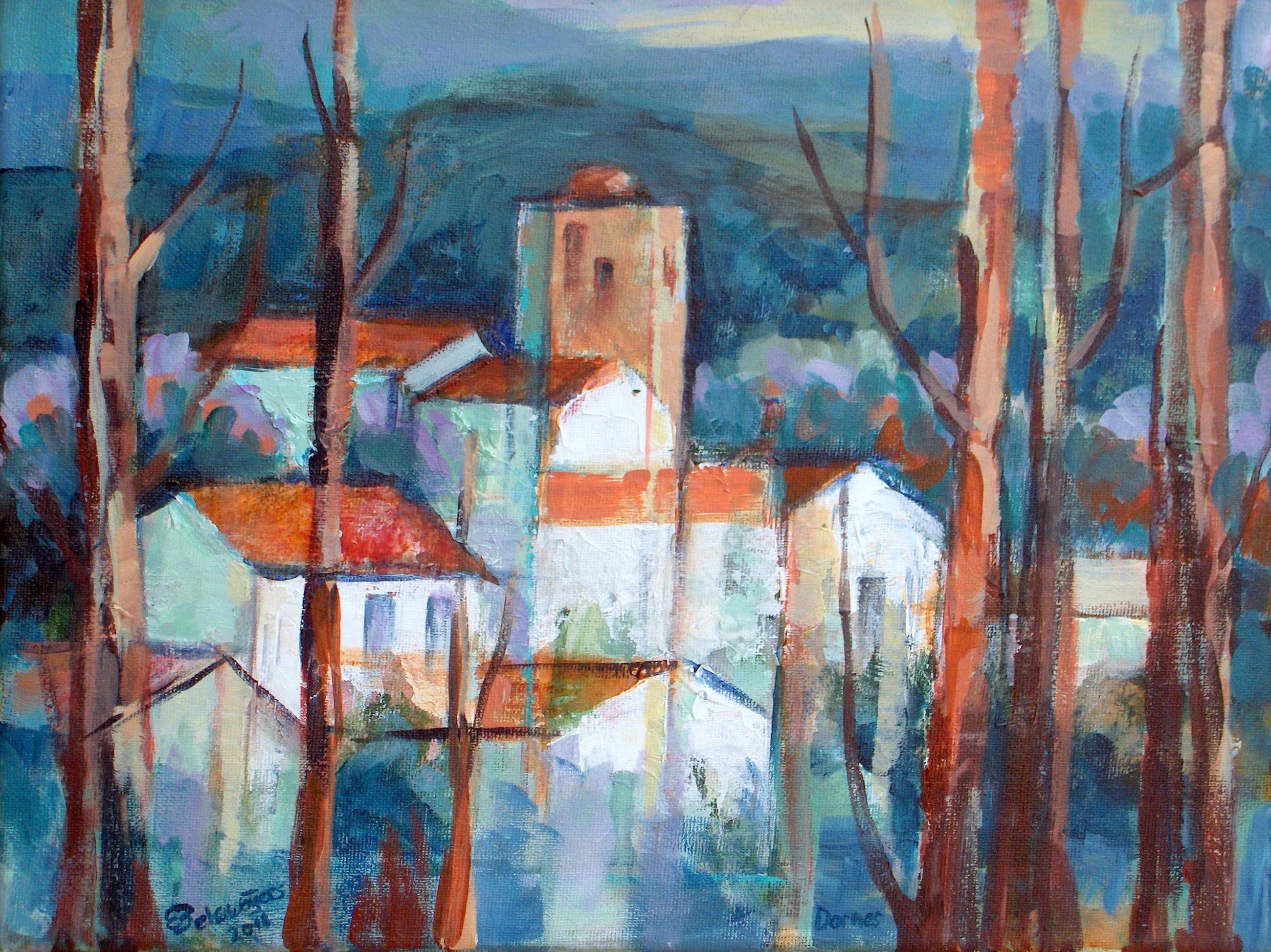 Dornes entre os Eucaliptes , Dornes, Portugal, tussen de Eucaliptus bomen. Acrylverf op doek.