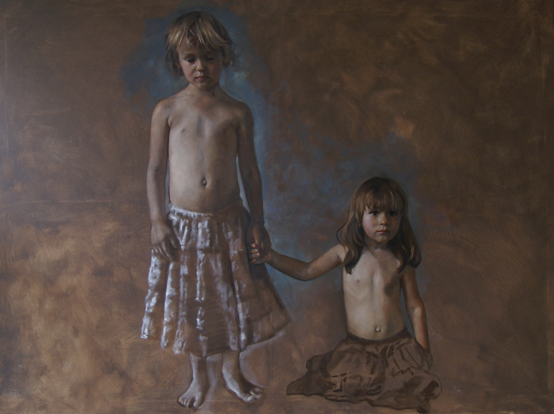 Groot portret (180cm x 140cm) van twee zusjes in omber