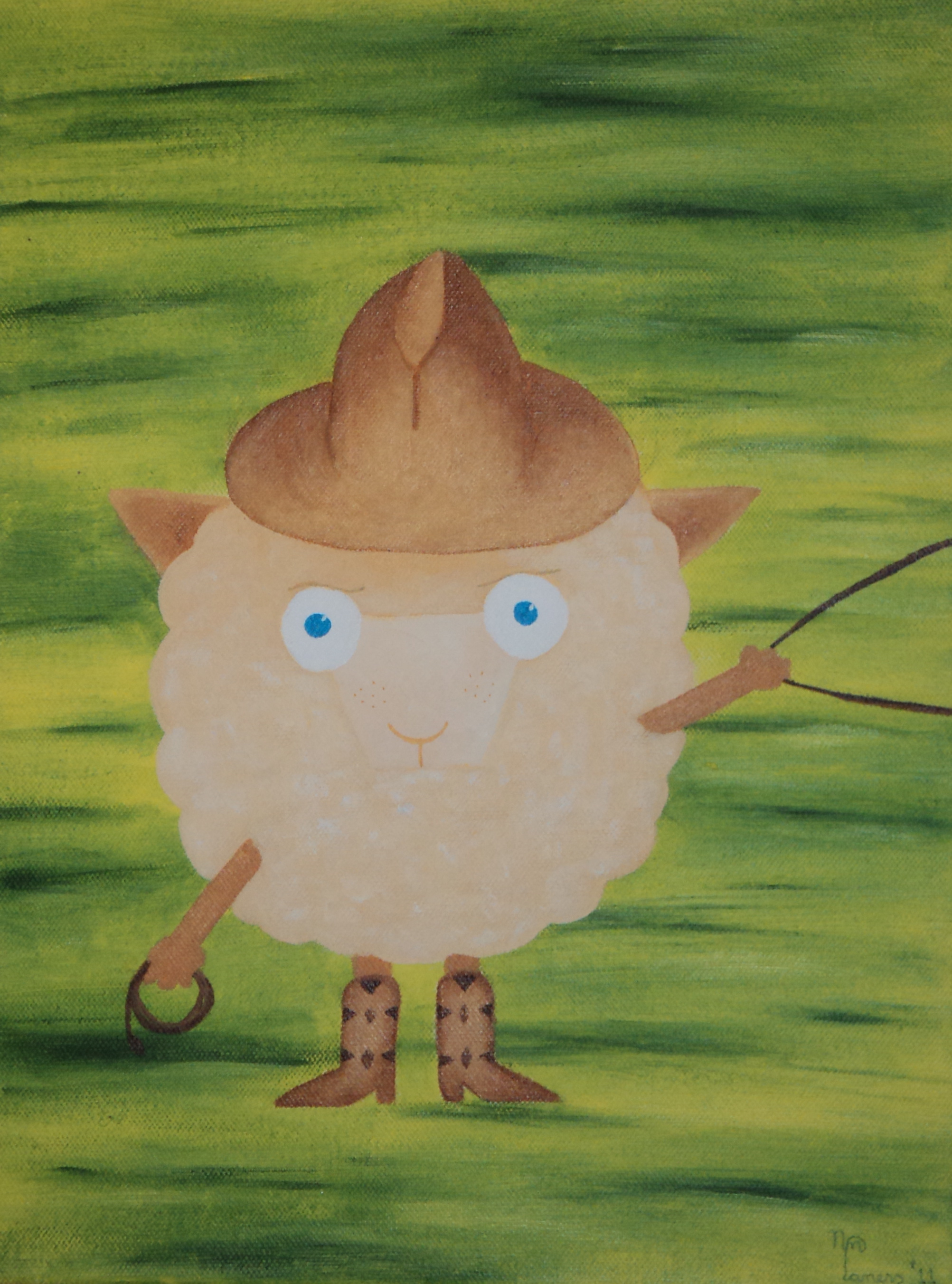 Schattig Lief Schaap Aandoenlijk Surrealistisch Grappig Gek Sheep Funny Adorable Cute Surrealistic Touching Cowboy Green Bruin Brown Groen Hoed Hat Boots Laarzen Alone Alleen Whip