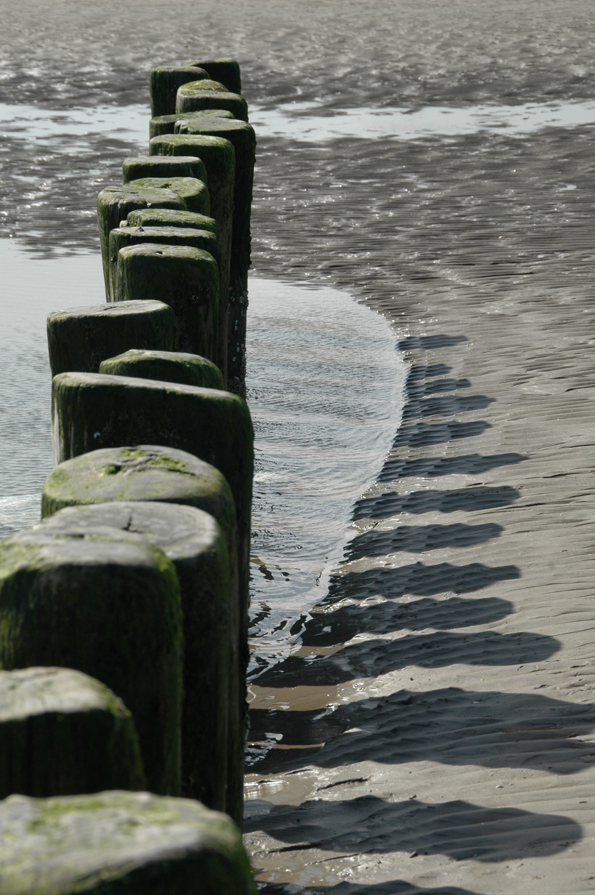 palen, schaduw en water op het strand, als de toetsen van een piano..