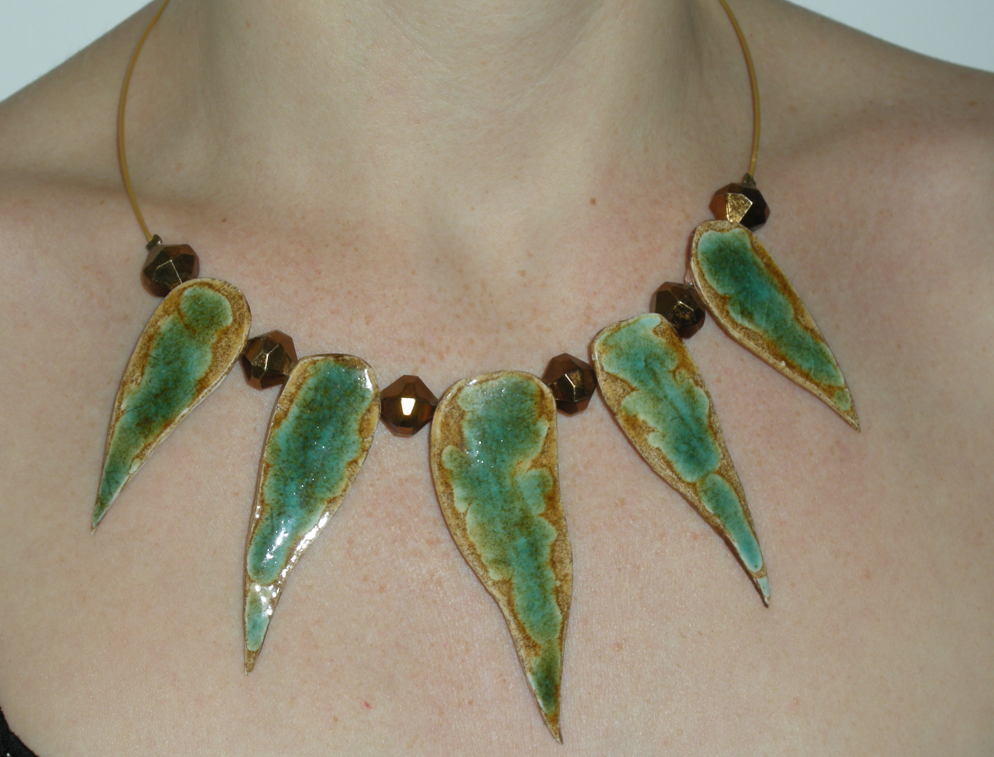 feestelijke ketting van porselein groen op honingkleurige ondergrond van 5 bladvormige kralen, gecombineerd met facet gevormde goudkleurige kralen.