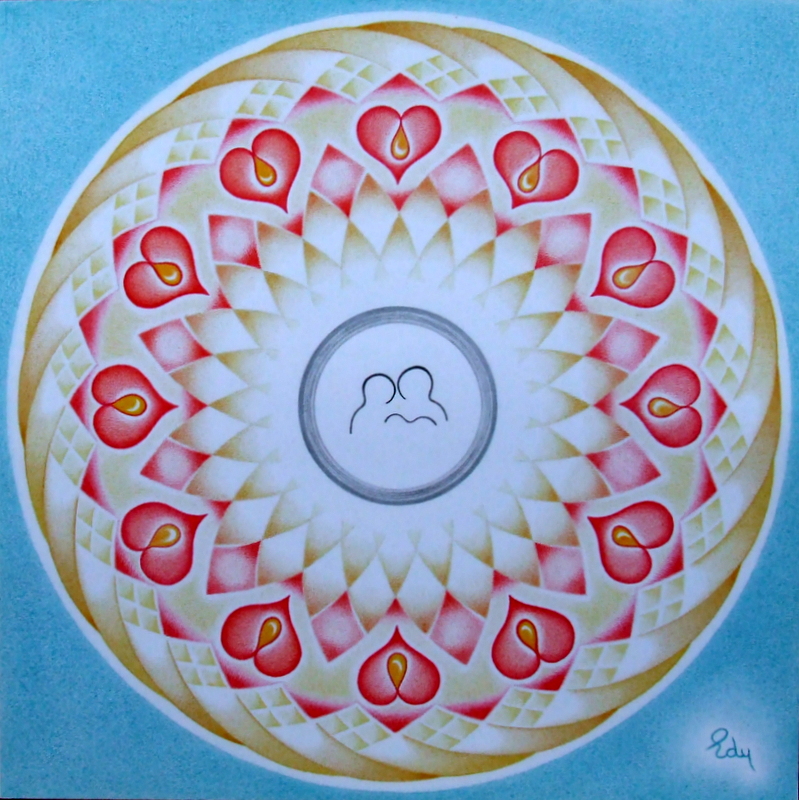 Edy combineert haar liefde voor kleuren en papier door blanco tekenvellen te vullen met in elkaar overvloeiende kleuren en mooie vormen. Vaak is een mandala de basis.