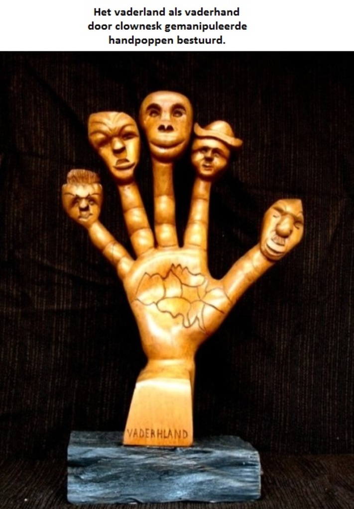 Vader(h)land Het vaderland als vaderhand door clownesk gemanipuleerde handpoppen bestuurd .