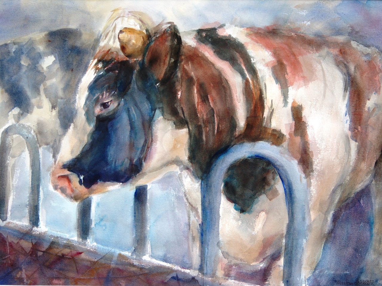 stier in de stal bij de buren; aquarel in passe-partout