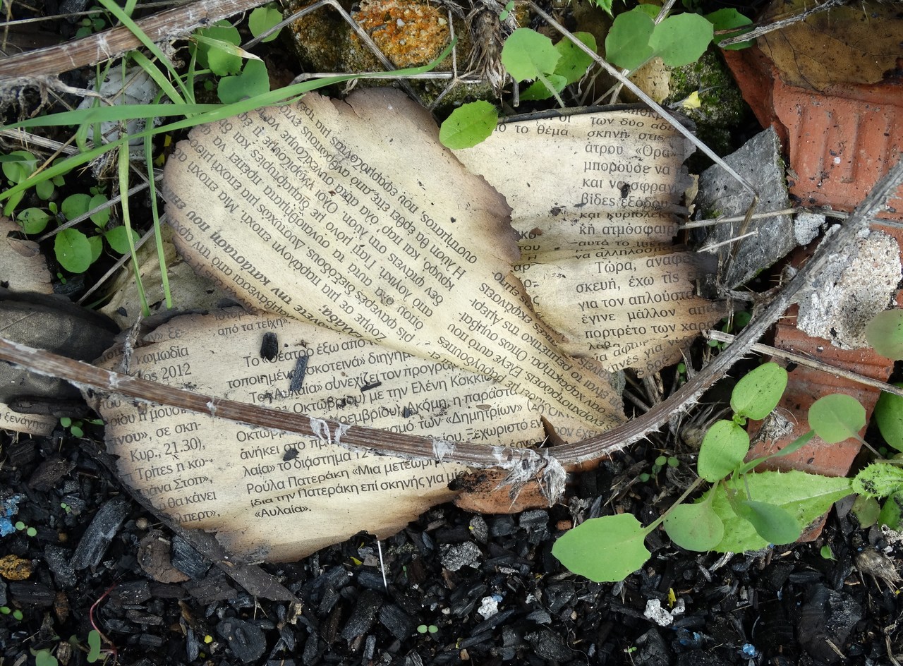 Drie bladen overleefden het vuur / en maken nu geschiedenis / to hedendaagse kunst / tenzij het nieuws ging / over hedendaagse kunst / dan is die nu verleden tijd.