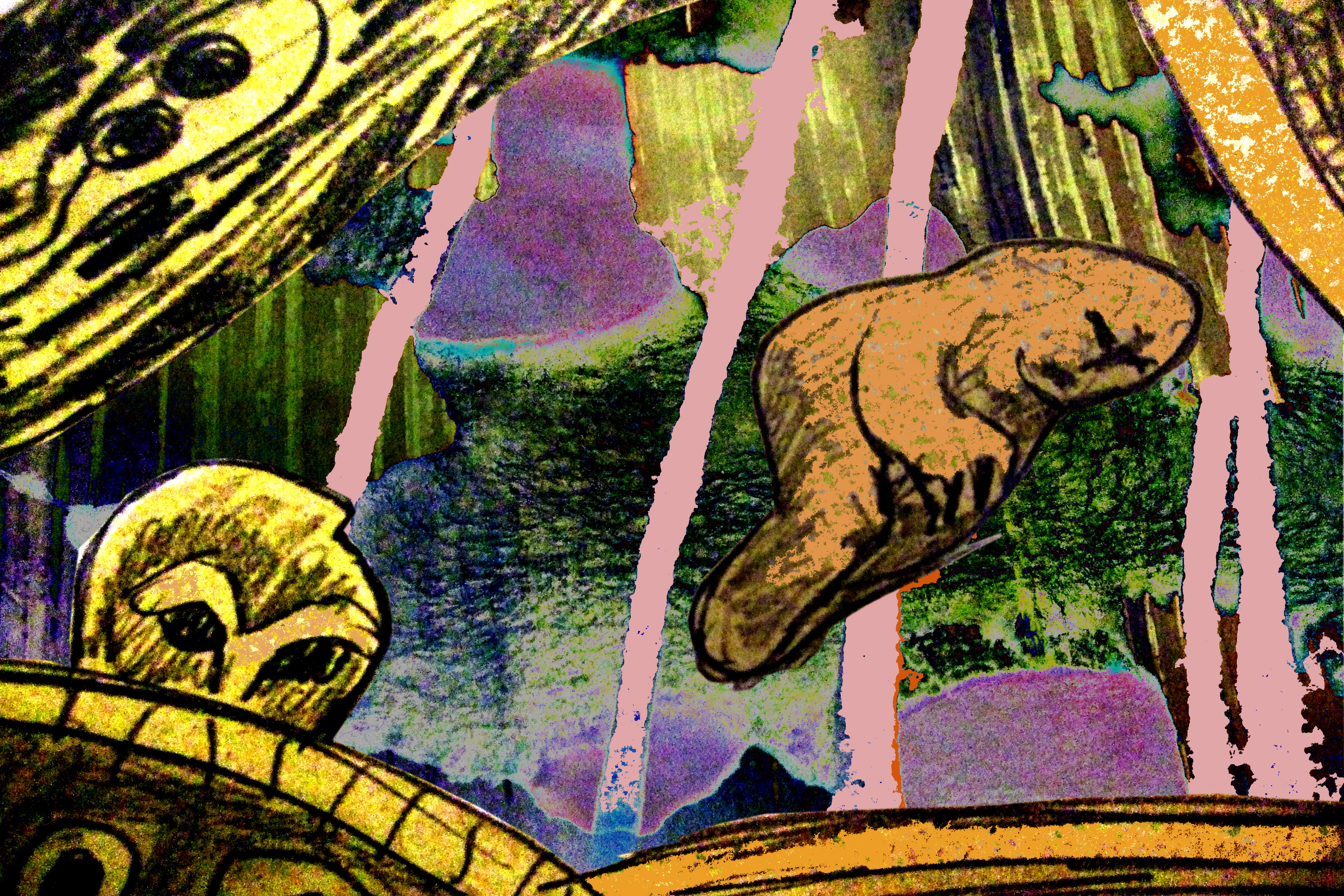Digigrafiek: Digitale collage van fragmenten uit verschillende tekeningen. Gedrukt op 310 grs Fine Art papier. Andere formaten mogelijk: bv. beeldformaat 75x50 cm= € 250,-- (papierformaat 85x60cm)