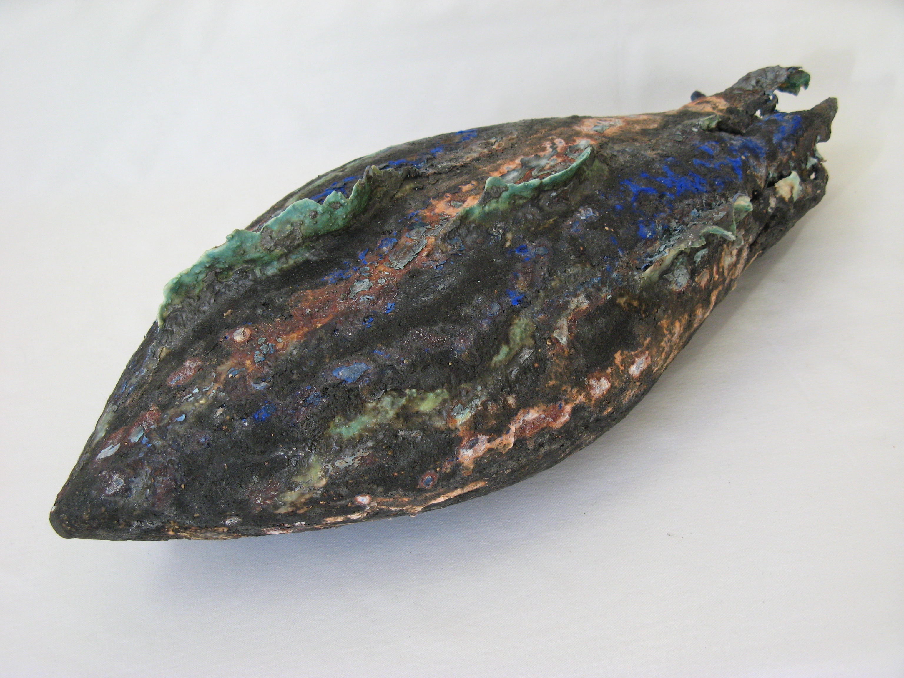Door de structuur en kleuren heb ik een oud en verweerd overblijfsel van een diervorm vormgegeven. Aardewerk, glazuur.