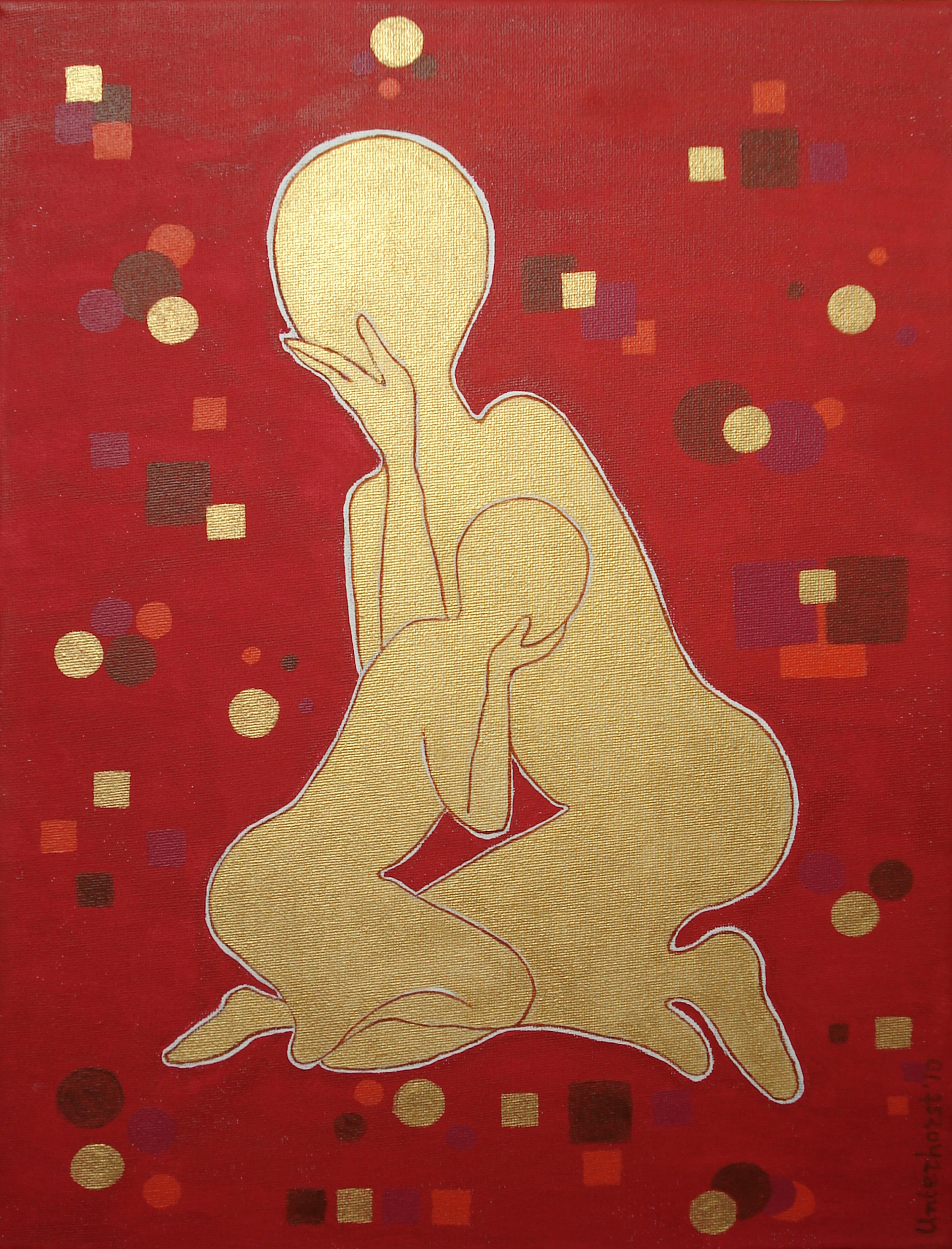 KOPP: Mijn moeder maakte een houtsnijwerk dat ik heb geschilderd. Je kunt het zien op de informatiepagina's onder "Houtsnijwerk". Je kunt daar ook lezen wat de symboliek erachter is en waarom het mij raakte toen ik het destijds van haar kreeg. Rood (als de kleur van de liefde voor haar) in de achtergrond. Maar ook de kleur van de emotie. De achtergrond heb ik met paarse, oranje en goudverf bewerkt in abstractere figuren. Moeder en kind lijken door de goudverf bijna ikoonachtig. Deze manier van schilderen wijkt af van mijn normale stijl van schilderen, maar dat komt omdat ik haar houtsnijwerk als uitgangspunt genomen heb.