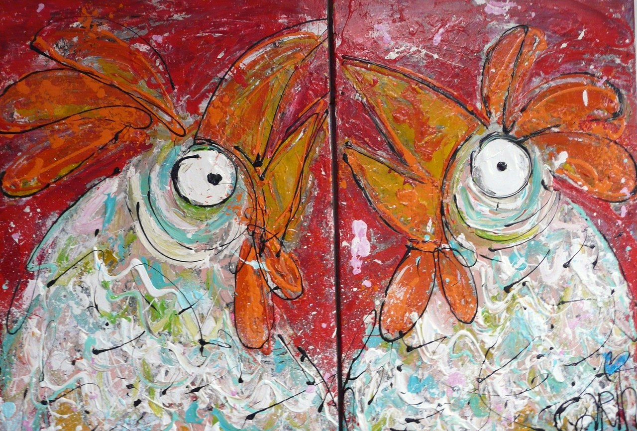 Kippen Rood Veel Verf Carin Kunst Vrolijk Humor