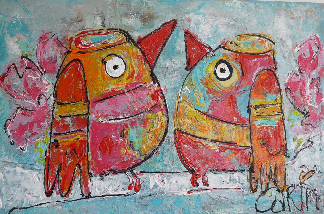 Ik schilder modern abstracte kunst . kunst waar je vrolijk van wordt Ik werk met heel veel acrylverf op doek Het werk is erg kleurrijk. Ik gebruik zoveel acrylverf dat er een 3 d effect ontstaat. Gebruik van warme felle kleuren. Ik lak mijn schilderijen met glans af .thema;s zijn dieren bloemen eten mensen. Humor in mijn werk vind ik erg belangrijk
