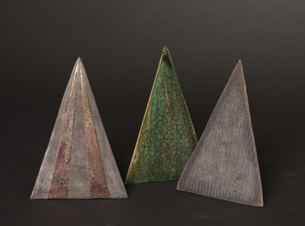 Geometrische en organische keramieke beelden meestal in rakustook technique. 2-dimensionale keramieken en lichtobjecten