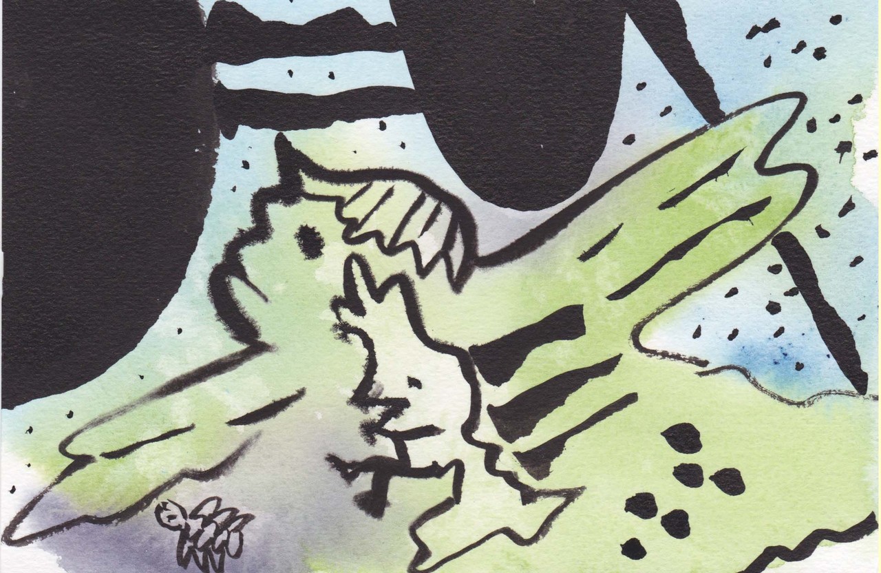 Deze tekening in inkt en aquarel is gemaakt tijdens een meditatie op de Tarot kaart zwaarden VI