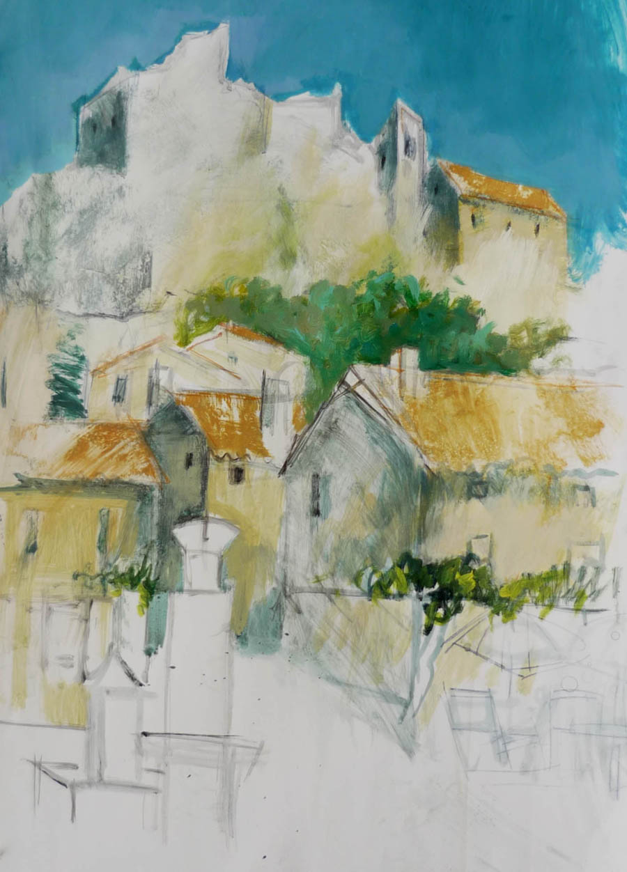 Snelle verf schetsen van landschap in de Provence. Dit is het gezicht op dorpsplein van Entrechaux,vlak bij Vaison la Romaine.