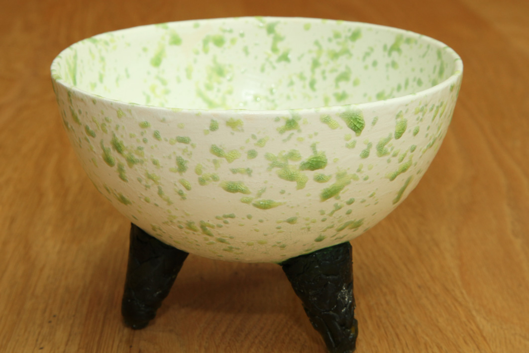 Schaal met groene glaskorrels en pootjes van glas