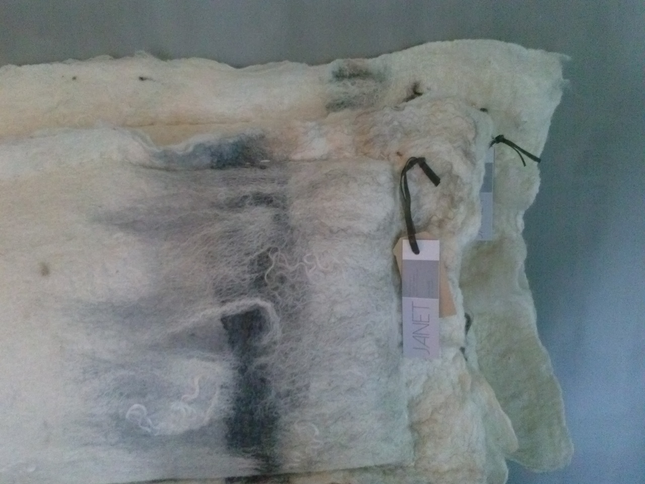 vilten kussen 100 x 50, materiaal merino wol, wensleydale lokken, texelaar, zijde en natuurlijke vezels.
