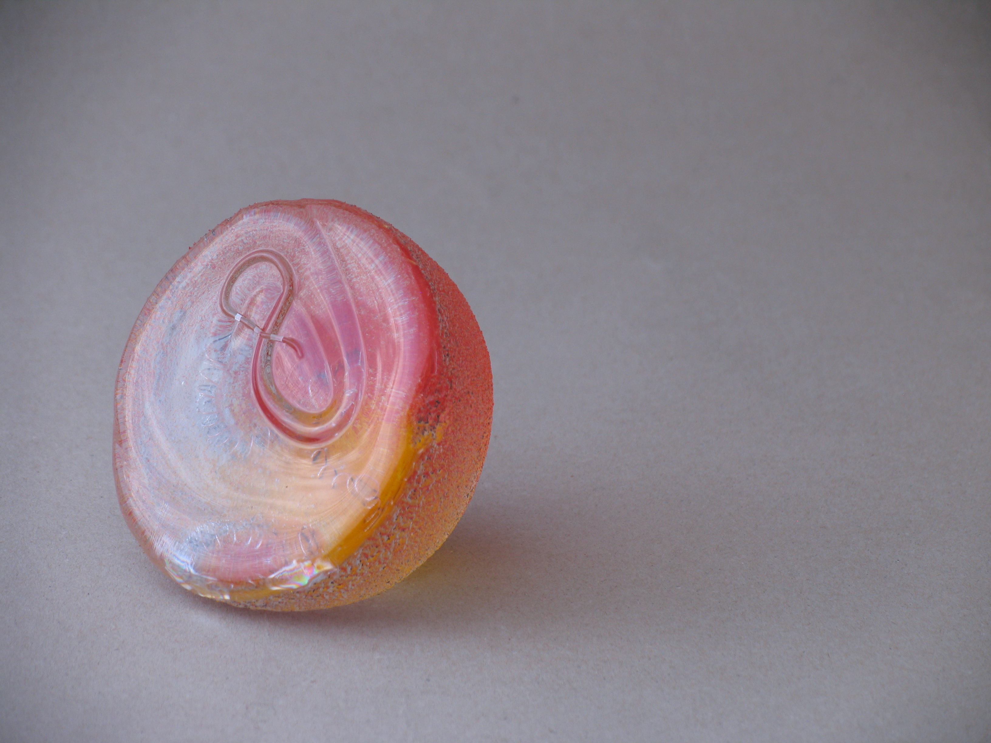 Gegoten glas in geel en rood met krul aan het oppervlak en geslepen voet