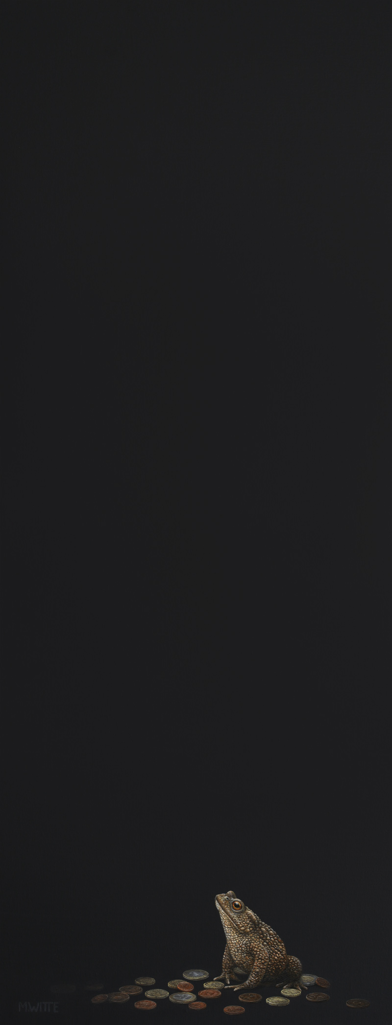 Pad in wensput. Het dier wordt omgeven door rijdom, maar is hij ook echt rijk! Het schilderij verbeeldt dat geld niet altijd gelukkig maakt.