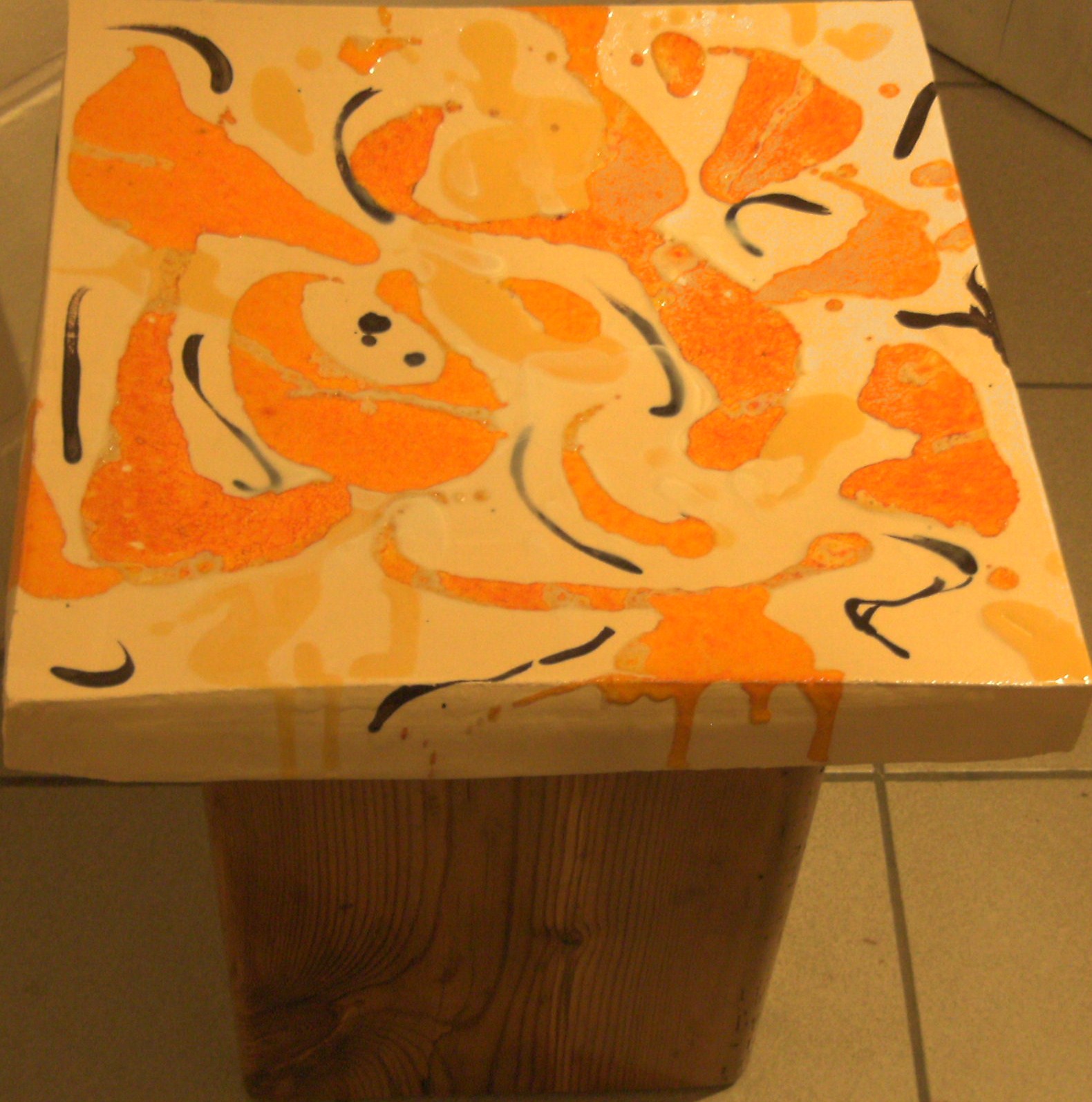 Een eenvoudig bijzettafeltje,maar uniek!Het blad is in keramiek en de voet in recup-hout