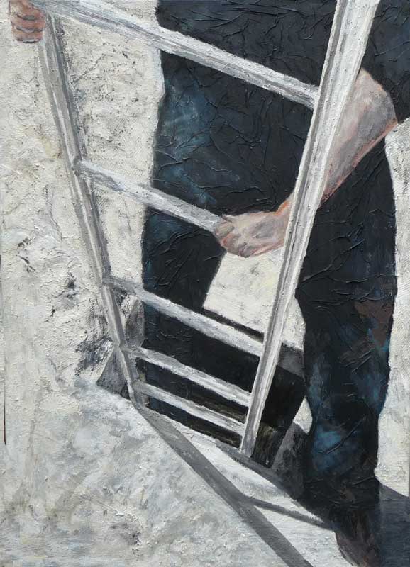 Iets in de buitenwereld intrigeert mij en door deze impressie uit te werken wordt zij blijvend deel van mijn binnenwereld. Laag na laag bouw ik aan de uiteindelijke vorm. Tijdens het werken komt er een stroom van associaties op gang. Het is een constant zoeken naar evenwicht tussen de verf en de andere materialen.