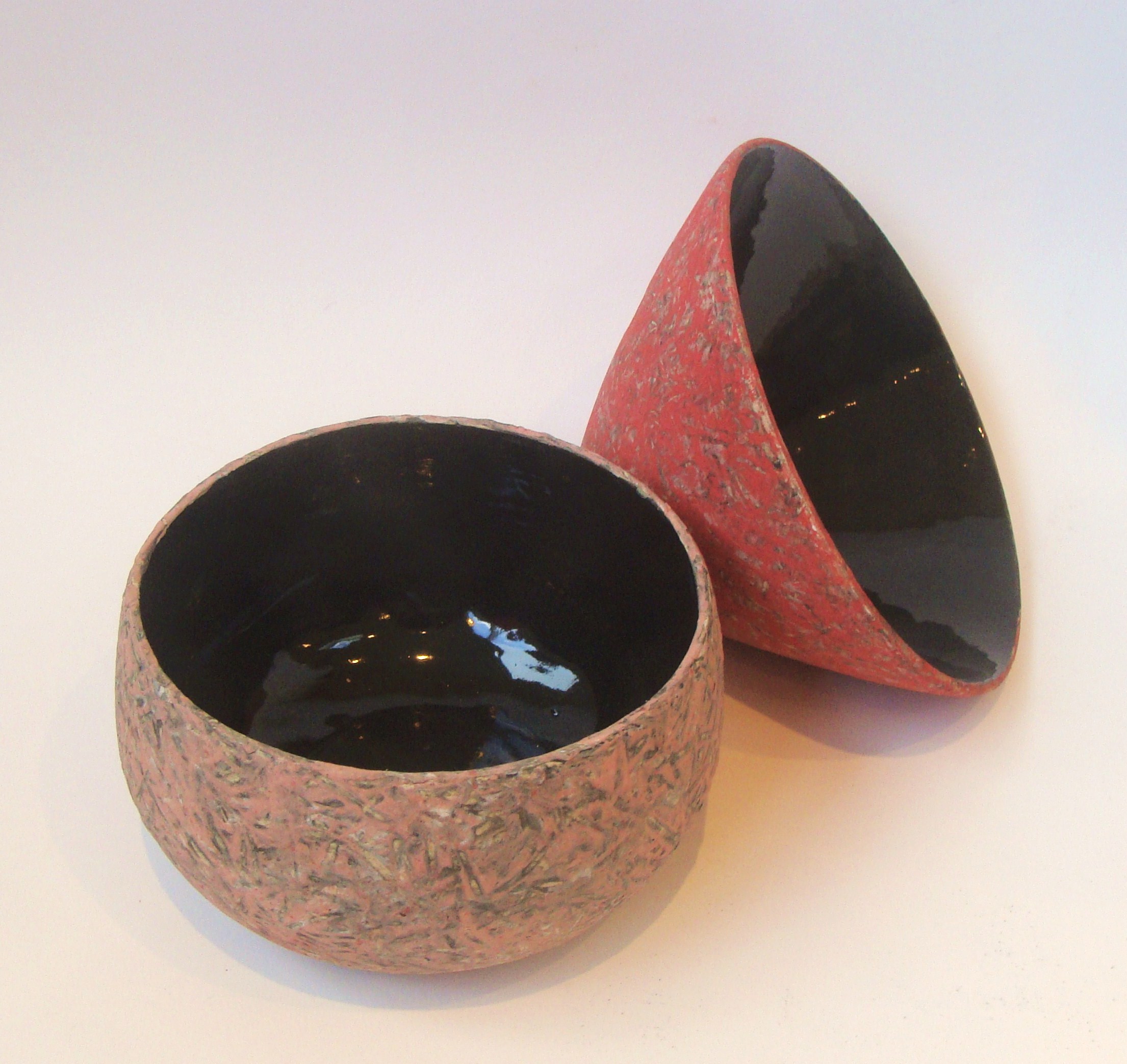 Diverse kommen, vooral interessant door de bewerking met verschillende engobes en pigmenten die erop gespateld zijn. In contrast met de glanzende glazuur binnenin de kommen.