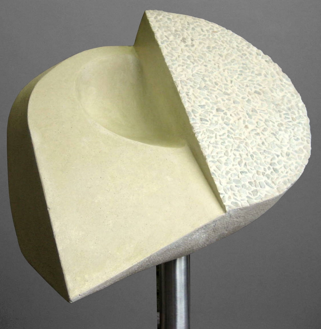 In (vrije) opdracht vervaardigde sculptuur waarbij een samenspel van positieve en negatieve ruimtelijke bolvormige lichamen wordt doorsneden door loodrecht op elkaar geplaatste vlakken, resulterend in een strak doch vloeiend werk. De “staart” van de komeet (de pijlvorm) zorgt voor de dynamiek. Één van de op deze wijze gecreëerde vlakken vormt een halve cirkel die - omwille van het contrast met het naastliggende gepolijste oppervlak - is ingelegd met Carrera marmerkorrels. Alle overige oppervlakten zijn afgewerkt in een ruwe (gebouchardeerde) structuur.