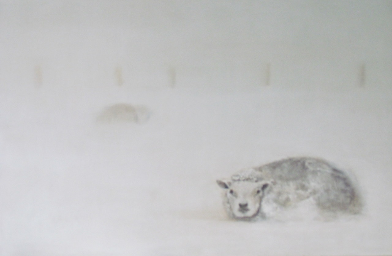 Schapen in mist en sneeuw