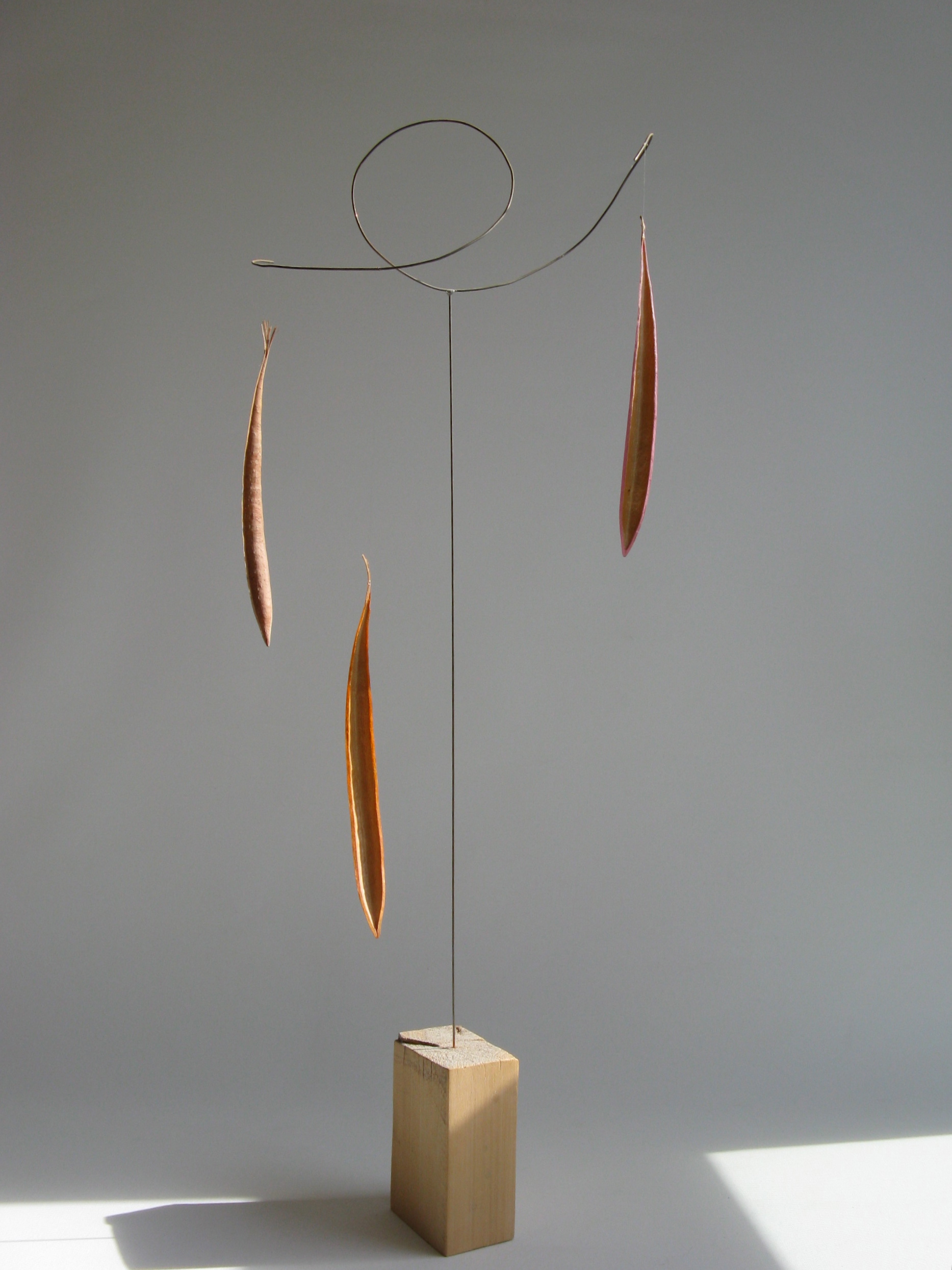 Materiaal: hout, acryl, metaal en natuurlijke zaadhuls.