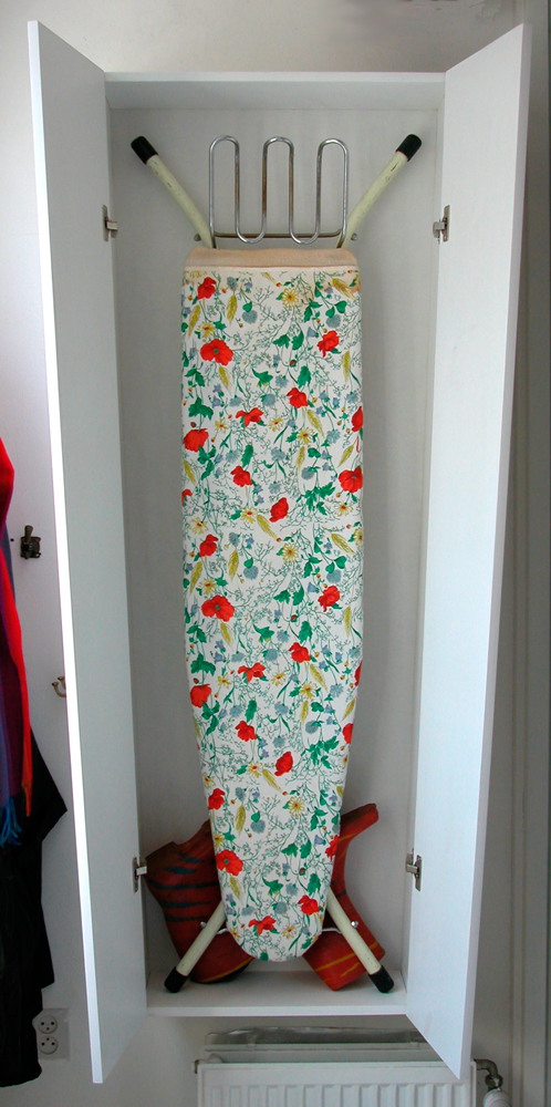 de vorm van de kast is ontleend aan de strijkplank die er in opgeborgen wordt