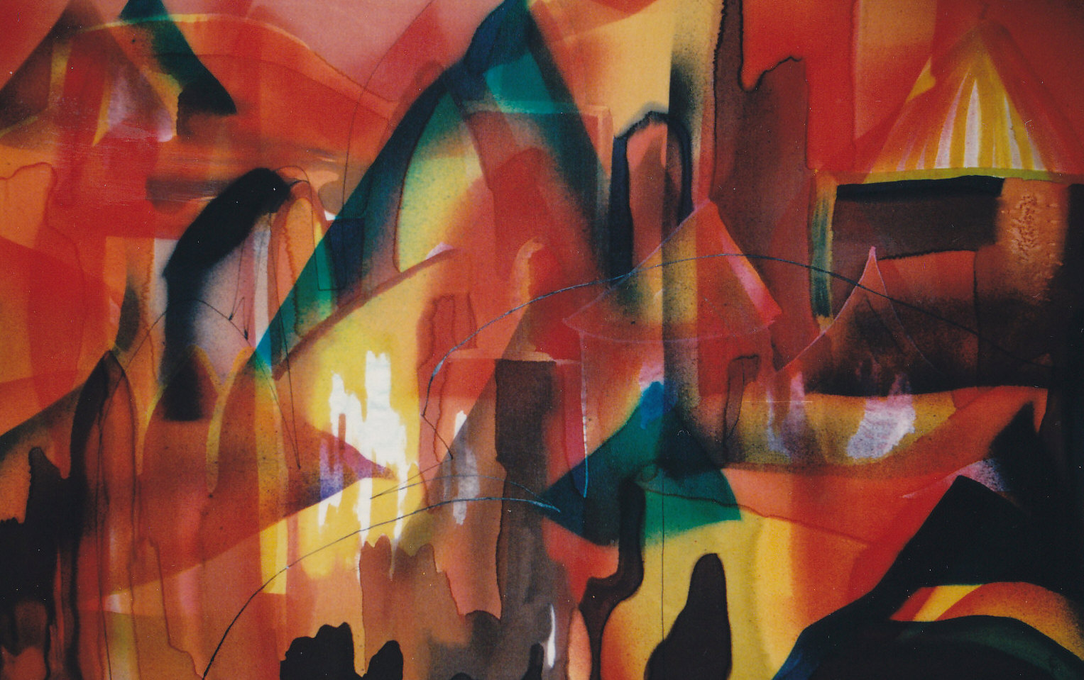 Dit werk ademt de sfeer van een Afrikaans dorp in de Dogon in Mali. Gespoten en geschilderd op zijde.