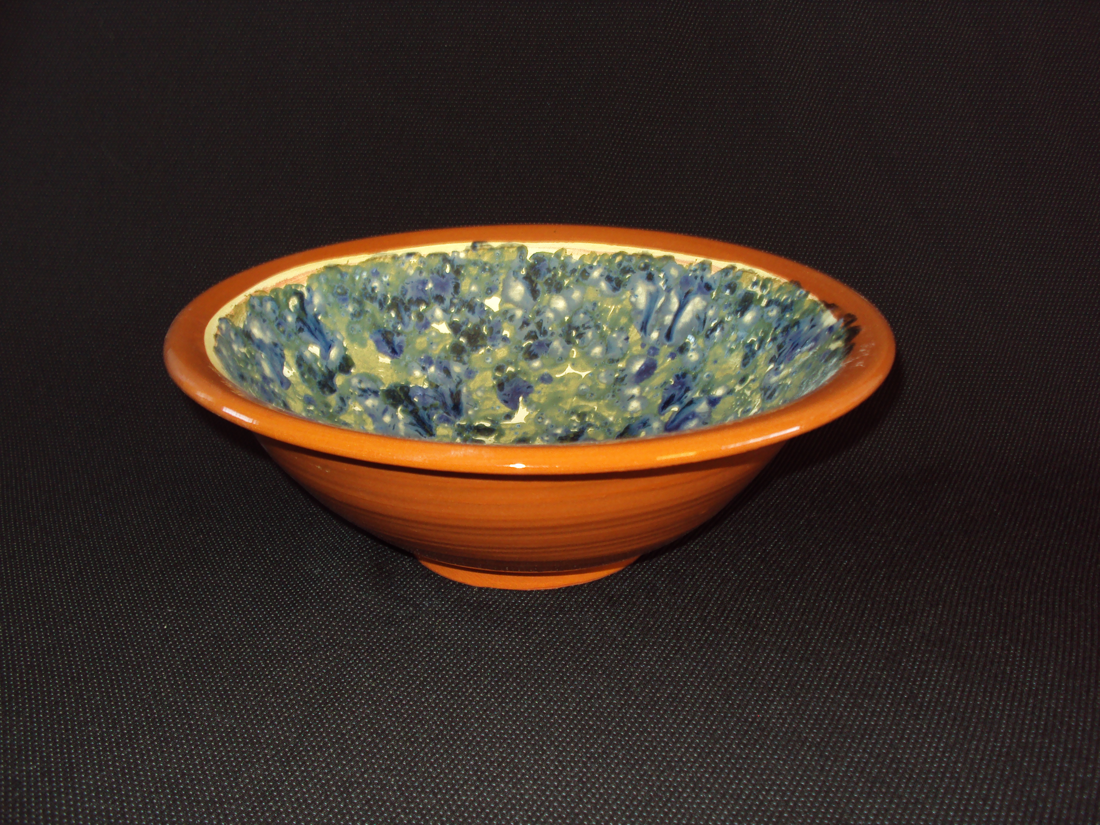 Schaal gedraaid van roodbakkende klei met slibdecoratie. Deels geglazuur met honingglazuur, deels met effectglazuur op witte slib.
