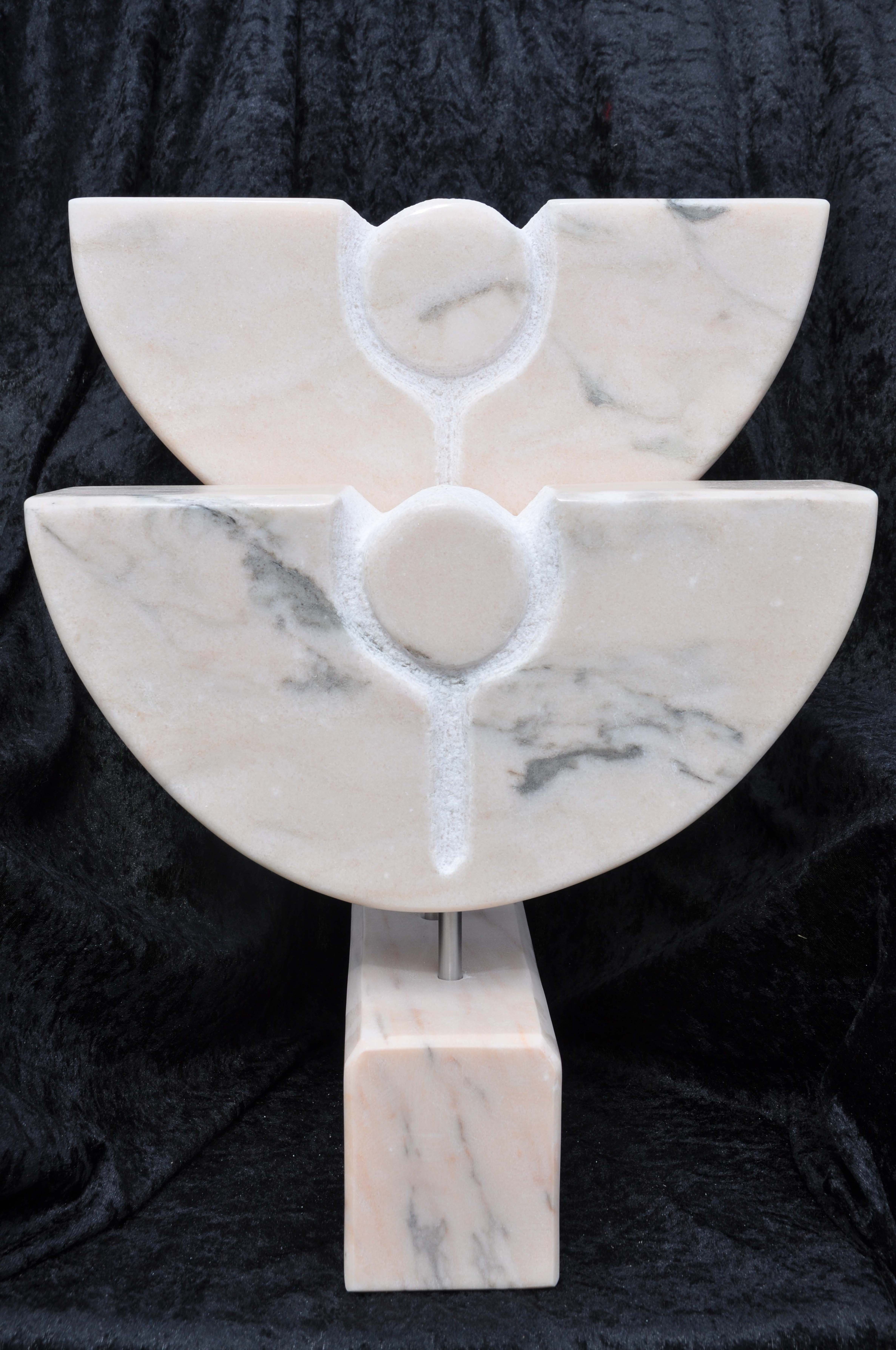 beeld van portugees marmer met de titel Sun (flower) Rise. het beeld bestaat uit drie delen verbonden met elkaar door " rvs-zuiltjes "