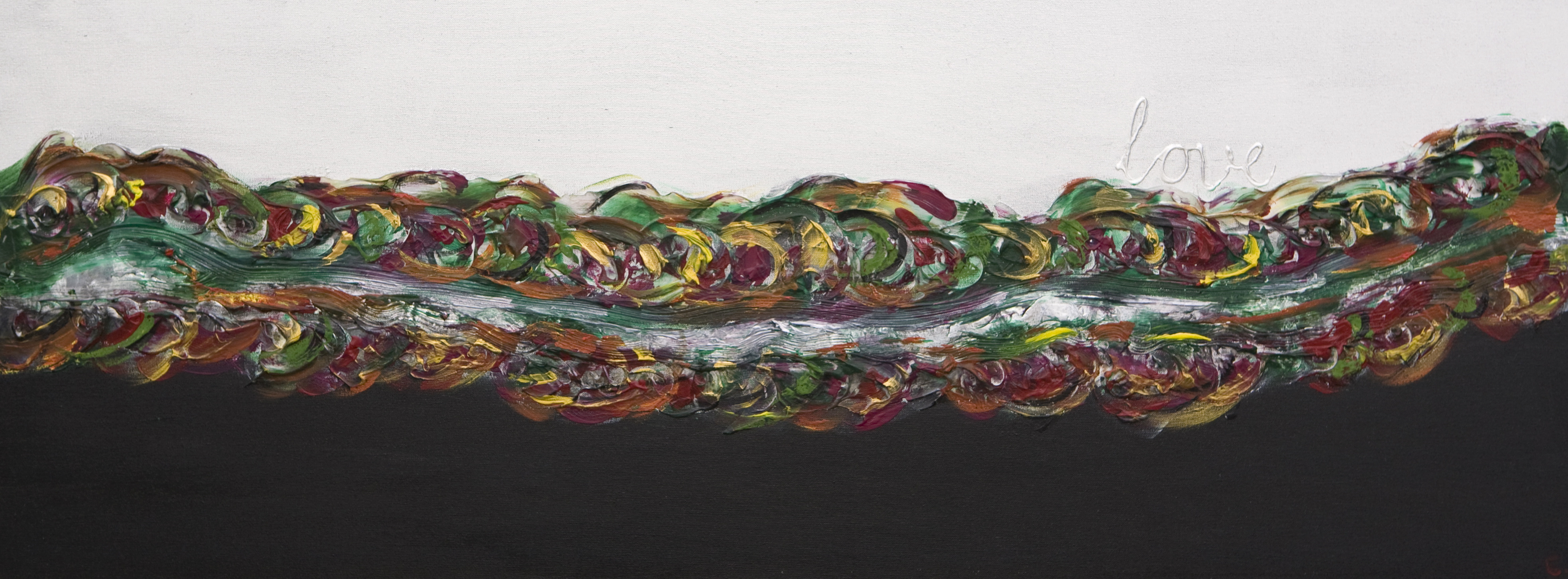 "LOVE RULES" Deel 1 van tweeluik. Gemengde technieken, acryl en zilverfolie en tekst: "love" Het leven kabbelt voort, maar de liefde overheerst. Prijs is voor complete tweeluik.