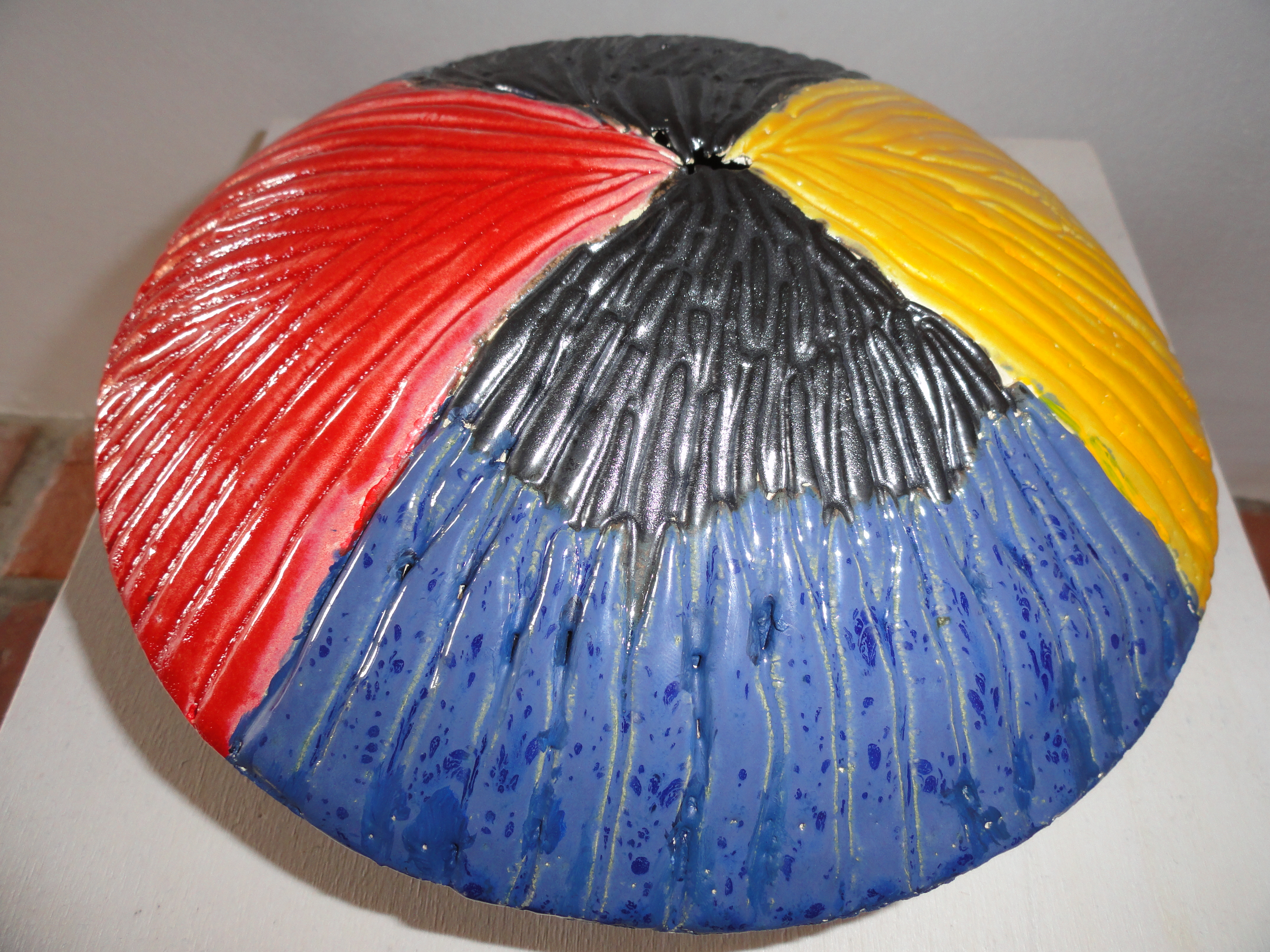 Serie zee leven: zee gras van witte klei; geglazuurd met gele, rode, blauwe en zilvere glazuren op een ronde gesloten vorm. Gestookt op 1060 graden