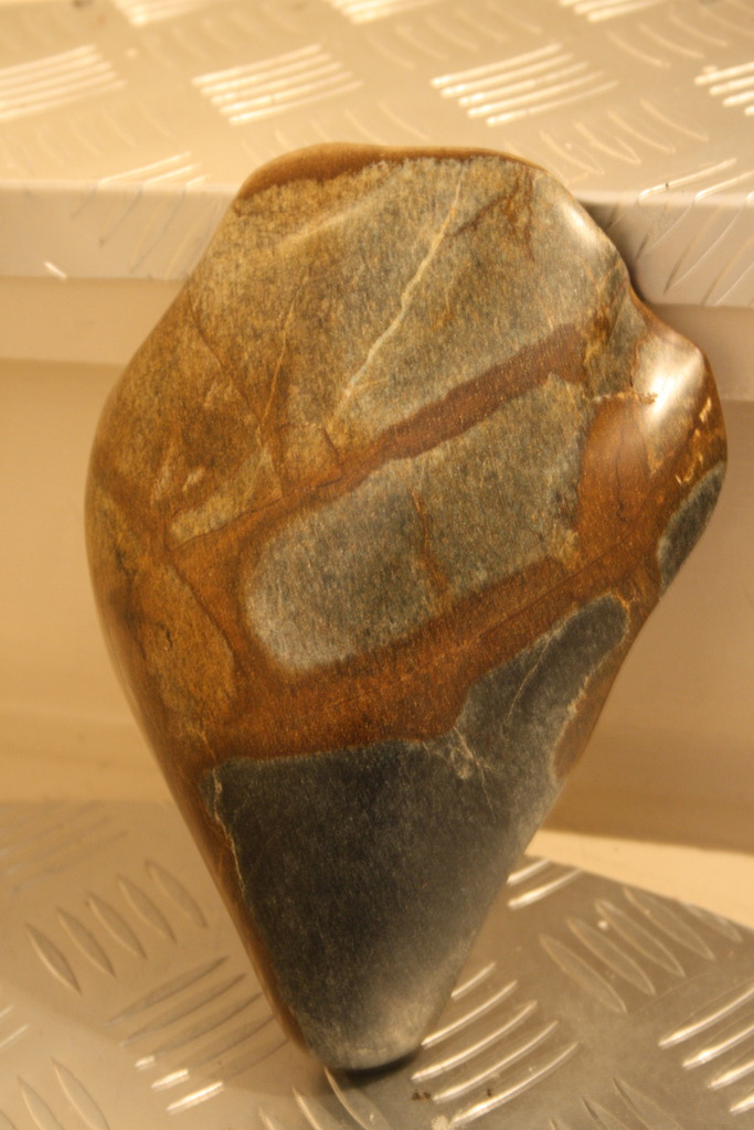 Mosselschelp van bruine Braziliaanse speksteen met draden van ijzererts, waardoor en bruine vlekken op de steen ontstaan.