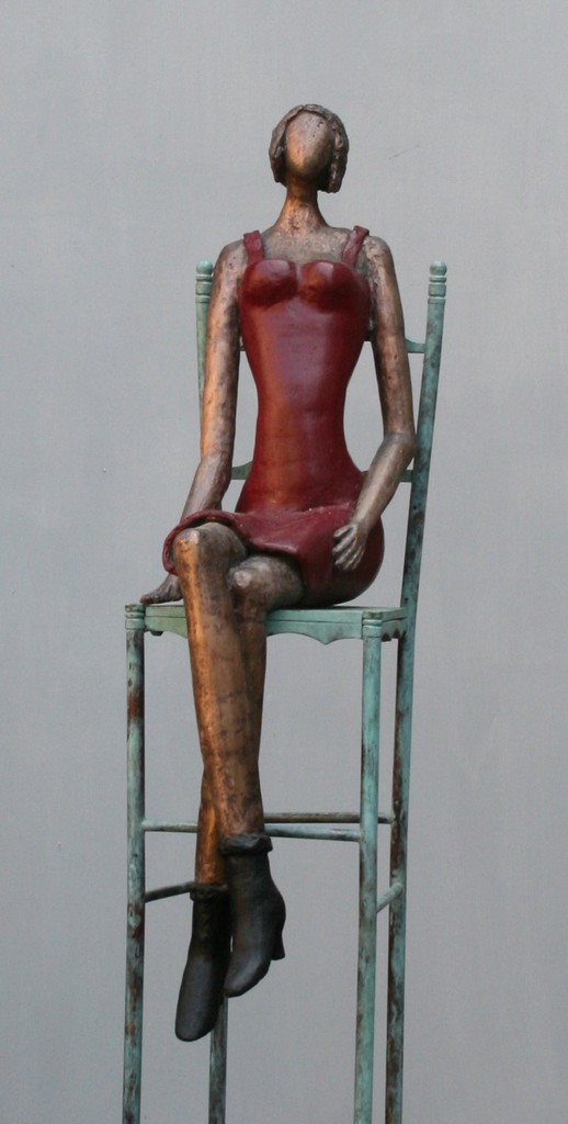 dame op hoog niveau op koperen stoel op haardstenen sokkel