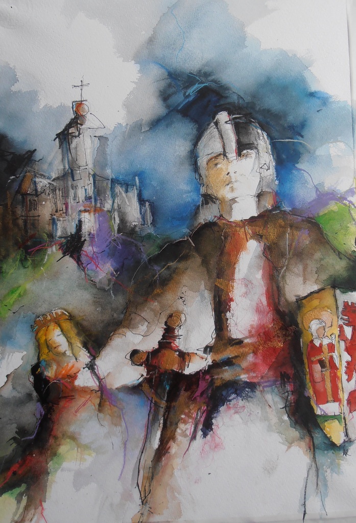 een aantal sfeerbeelden uit de legende van Ridder Kuno; stichter van Kunrade (Voerendaal). Trotse Ridder Kuno wordt hier in zijn ridderpak gewapend met zwaard geportretteerd, omringd door : Links boven zijn kasteel gelegen in de kunderberg. Links beneden zijn geliefde Aldegonde Het wapen van Voerendaal komt terug in het schild van Kuno 1e prijs schilderwedstrijd Voerendaal met thema "Ridder Kuno"