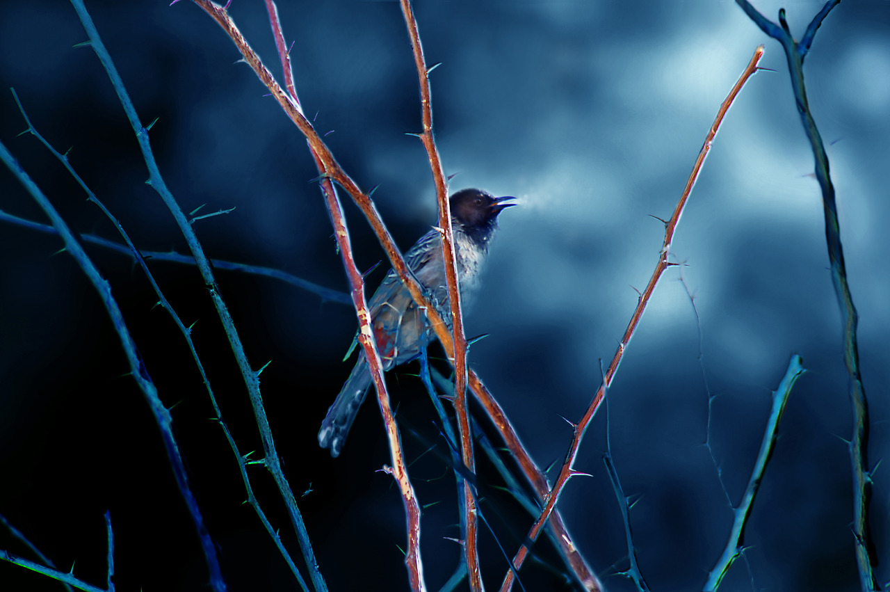 Rood Blauw Vogel Wolken Kleuren Nacht Schemer Bird Takken Zang Fluiten Singing Zingen Ochtendgloren Ontwaken Morgen Roepen Zangvogel Lokken Condens Lokvogel