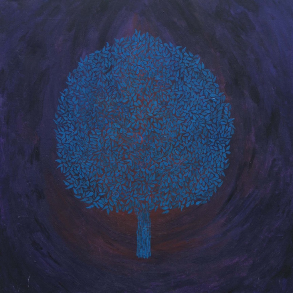 Met de warmte van de rood en de diepte van het paars achter de blauwe boom