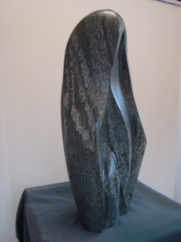 Een ingetogen verschijning, met een klein individu, dat bescherming zoekt tussen de vleugels. Het beeld is gemaakt van een prachtige, donkergroene / zwarte serpentijn met een heel mooie tekening.