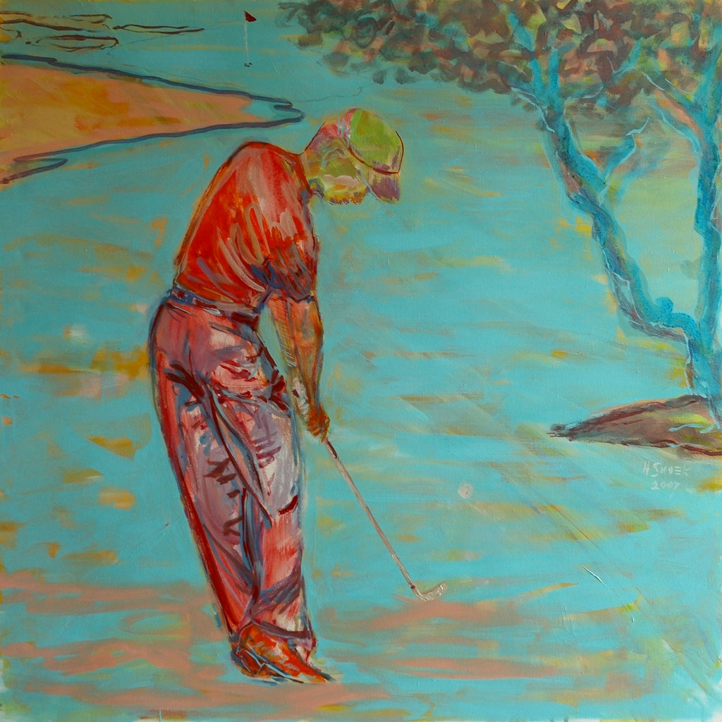 golfer maakt zich op voor een chip naar de groen... Laat die bal nu eens voor één keer bij de vlag landen...